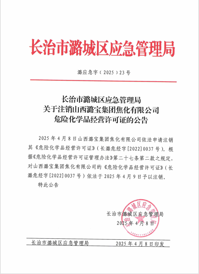 关于注销山西潞宝集团焦化有限公司危险化学品经营许可证的公告