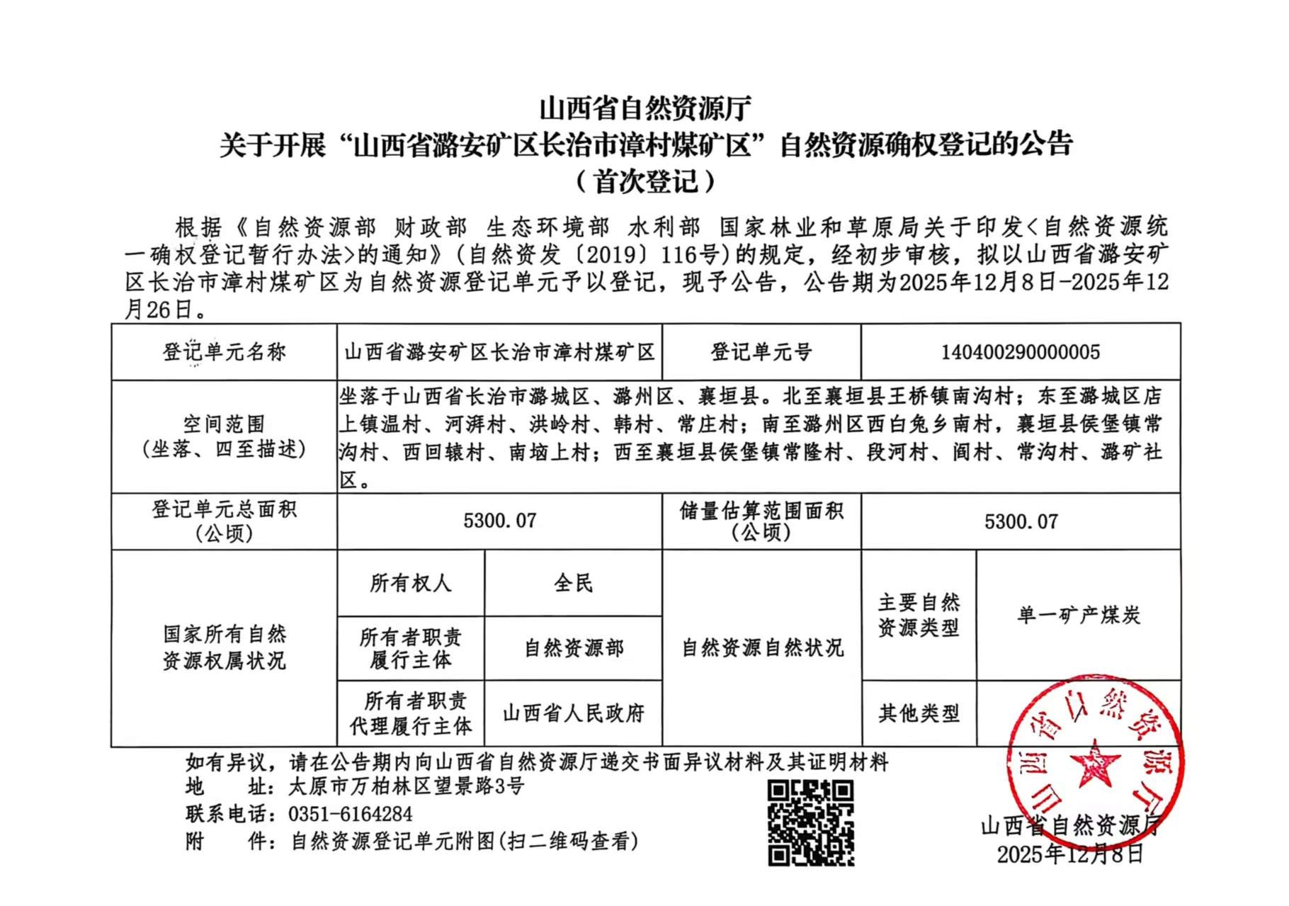 山西省自然资源厅关于开展“山西省潞安矿区长治市漳村煤矿区”自然资源确权登记的公告(首次登记)