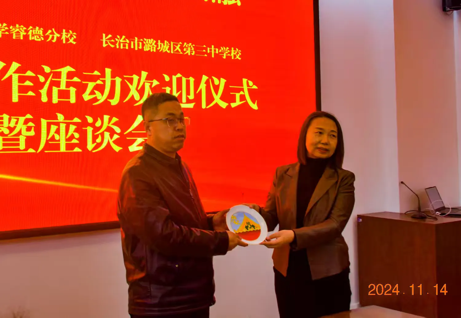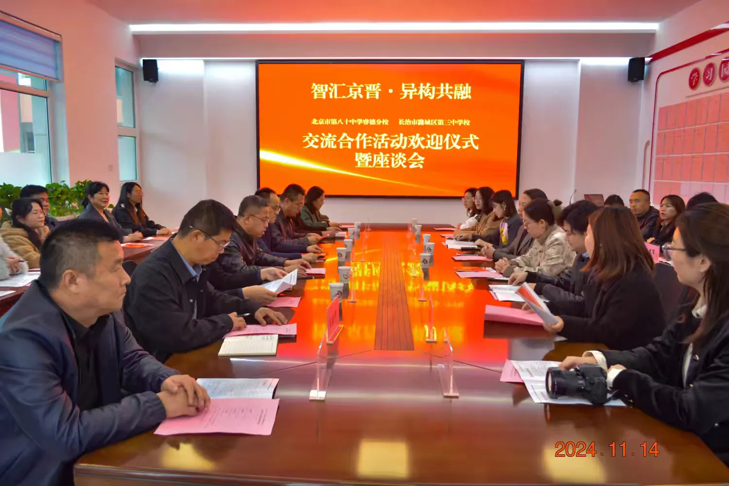 11月14日下午,本次交流合作活动欢迎仪式暨座谈会在潞城三中东三楼小会议室举行。
