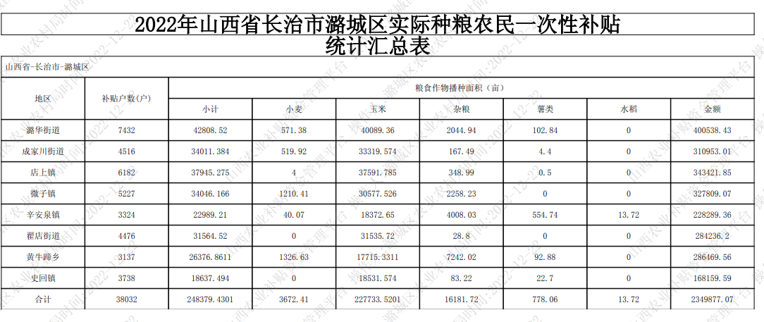 2022年实际种粮农民一次性补贴资金发放情况公示