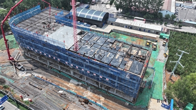 走进项目现场,一派繁忙的画面映入眼帘。工人师傅们正头顶烈日紧张而有序地为主体结构封顶而忙碌着。
