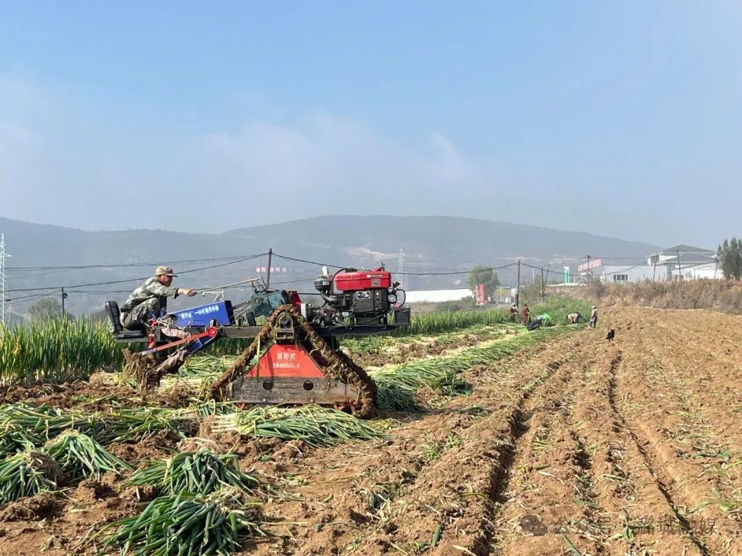 田垄上,自动起葱机往来穿梭,将挺拔青翠的大葱连根拔起、修剪整理、抖土规整,一气呵成,村民们则麻利地将规整好的大葱捆扎成束。
