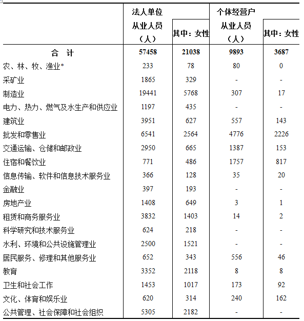 2023 年末,全国第二产业和第三产业法人单位从业人员57458人,比2018年末增加12077人,增长26.61%,其中女性从业人员21038人。第二产业从业人员26094人,增加1454人,增长5.9%;第三产业从业人员31364人,增加10623人,增长51.22%。个体经营户从业人员9893人,其中女性从业人员3687人。