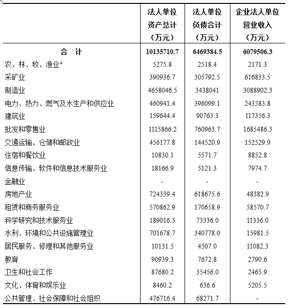 注:表中农、林、牧、渔业仅包括从事农、林、牧、渔专业及辅助性活动的单位数据。表中企业法人单位,包括机构类型为企业的法人单位,以及执行企业会计制度的事业法人单位、民办非企业法人单位和基金会,农民专业合作社,农村集体经济组织和除宗教活动场所以外的机构类型为其他组织机构的法人单位。表中房地产业包括房地产开发经营、物业管理、房地产中介服务、房地产租赁经营和其他房地产业。
