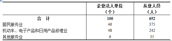 2023年末,全区共有居民服务、修理和其他服务业企业法人单位100个,从业人员652人,分别比2018年末增长127.3%和245.0%(详见表5-4)。