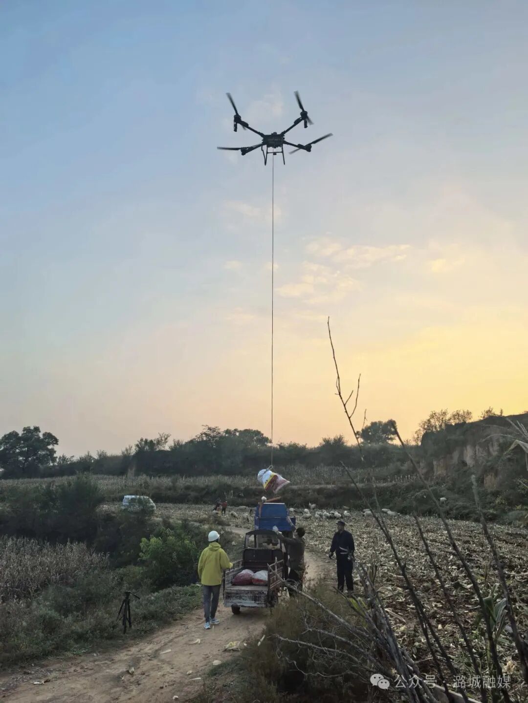 针对部分机械无法直达的“抢收难”地块,当地创新引入无人机吊装服务。一次可吊装150斤,平均每3分钟完成一次运输,效率是人工运输的20至30倍,实现了玉米从田间到转运点的快速衔接,彻底打通了秋收“最后一百米”,确保每一颗玉米都能及时收回。